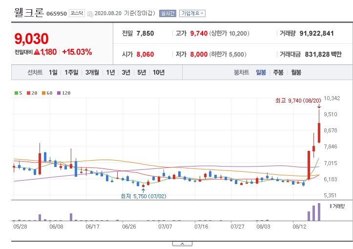 첫 번째로 소개해드릴 종목은 웰크론입니다. 오늘 하루 동안 주가가 15% 상승한 모습이네요. 최근 들어 코로나 확진자 수가 급격히 증가하면서 마스크 관련주들이 눈에 띄게 상승하고 있는 거 같습니다. 웰크론은 그중에서도 가장 급격한 주가 상승을 보인 종목입니다. 하지만 코로나 재확산 우려가 생기기 전의 주가 현황은 좋다고 볼 수는 없네요. 적절한 시기에 투자하시는 게 좋을 듯합니다.