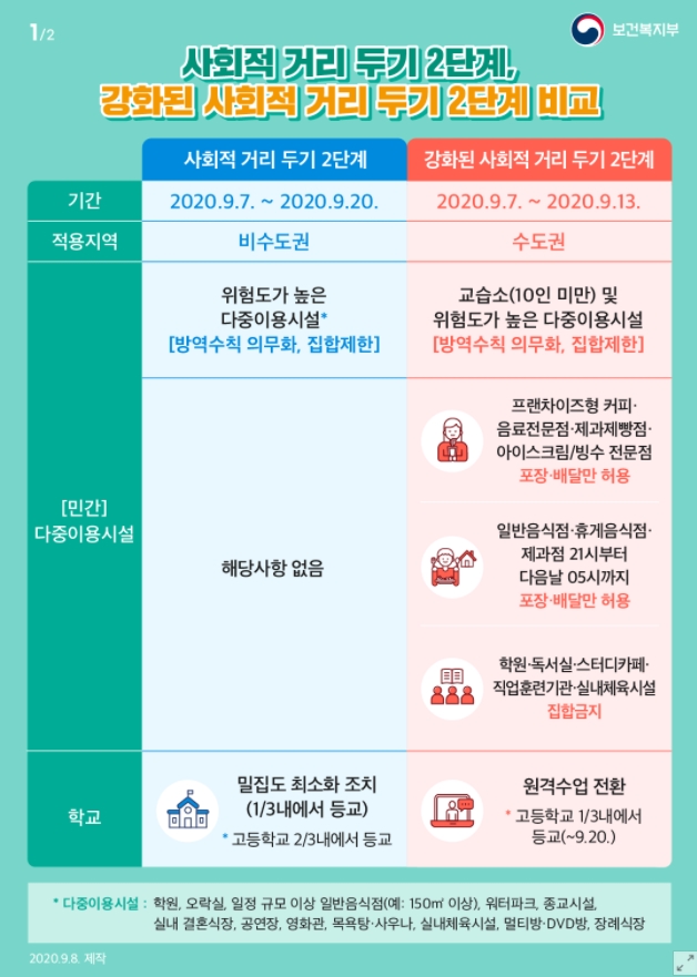 2.5단계에서 어떻게 진전될지가 관건이었는데요.. 다행스럽게도 정부가 9월 14일 월요일부터 27일 일요일까지 2주간 2단계로 하향 조정한다고 발표했습니다.