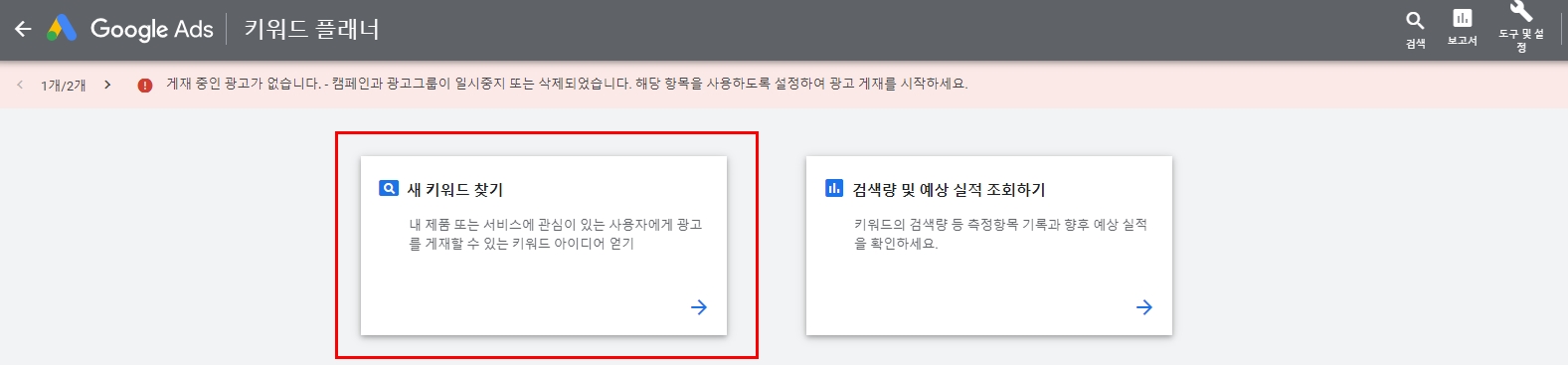 그러면 새 키워드 찾기와 검색량 및 예상 실적 조회하기가 뜨는데 새 키워드 찾기를 선택합니다.