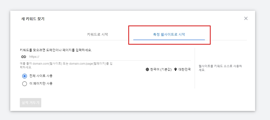 원래는 '키워드로 시작'이 선택된 창이 뜹니다. 오른쪽 '특정 웹사이트로 시작'을 클릭하면 다음과 같이 창이 뜹니다.