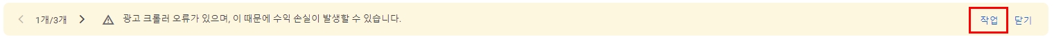애드센스 수익을 확인하려 구글 애드센스 사이트에 들어갔는데 이런 경고문구가 뜨더라구요..ㅠㅠ 광고 크롤러 오류라니.. 그게 대체 뭐죠..? 수익 손실이 발생할 수 있다는 글을 보고 걱정이 되서 무슨 문제가 있는 건지 경고문구의 우측에 있는 '작업'을 클릭해 확인해봤습니다.