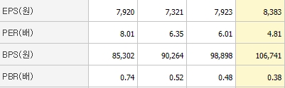 PER은 10배를 넘지 않는 것으로 보아 고평가 된 종목은 아니지만 동일업종과 비교했을 때 약간 높은 편입니다. PBR 수치도 양호합니다. EPS도 꾸준히 상승하고 있는 것을 보아 경영실적은 양호한 것으로 보입니다.