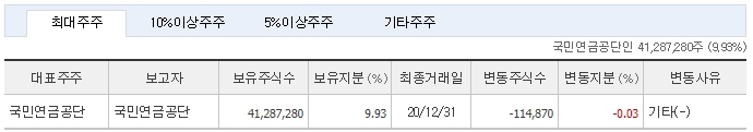 국민연금공단이 약 10%의 지분을 보유하고 있습니다.