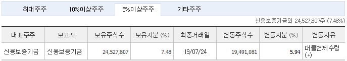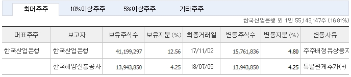 최대주주는 한국산업은행으로 약 12%의 지분을 소유하고 있습니다. 또한 신용보증기금이 7%의 지분을 갖고 있습니다.