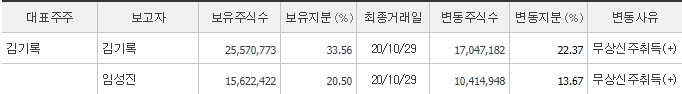 대표주주로는 코리아센터의 대표인 김기록님이 33%의 지분을 갖고 있습니다.
