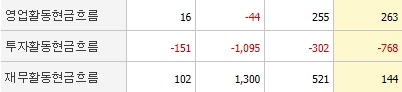 현금흐름 현황은 아직 상승곡선을 타지 않은 듯합니다. 하지만 영업활동현금흐름은 양호한 편이기 때문에 조금 더 지켜볼 필요가 있을 거 같습니다.
