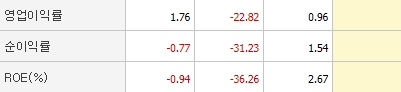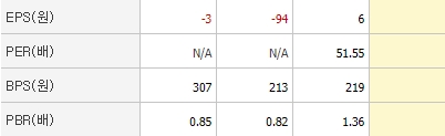 2020년 9월 분기 기준 PER은 -6.90으로 동일업종과 비교했을 때 많이 저평가된 종목으로 보입니다. PBR수치도 1.83으로 동일업종 비교 낮은 편입니다.
