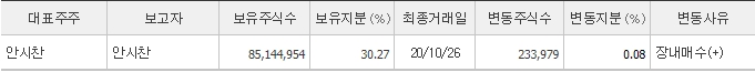 대표주주로는 자안그룹의 대표 안시찬님이 약 30%의 지분을 갖고 있습니다.