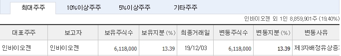 최대주주인 인바이오젠이 약 13%의 지분을 소유하고 있습니다. 인바이오젠은 4차 산업혁명을 선도하는 블록체인 플랫폼 기업입니다.
