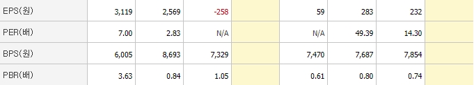 EPS는 계속 상승하고 있으니 경영실적은 양호한 것으로 보이나 PER는 동일업종과 비교해봤을 때 조금 높은 편입니다. PBR도 1배가 되지 않으니 성장력이 높다고 판단됩니다.