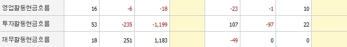 현금흐름 현황을 살펴보면, 투자활동현금흐름은 2019년에 비해 많이 개선된 것으로 보입니다. 영업활동현금흐름과 재무활동현금흐름은 아직 큰 변동이 없는 것으로 보아 조금 더 지켜볼 필요가 있을 듯합니다.