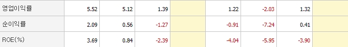 영업이익률은 양호한 편이지만 ROE는 2019년 12월 분기를 기준으로 계속 적자를 보이고 있기 때문에 조금 더 지켜봐야 할 듯합니다.