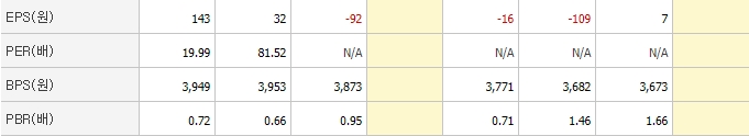 PER은 2020년 9월 분기 기준 -31으로 동일업종에 비해 낮은 편입니다. PBR 수치도 양호한 편이긴 하지만 EPS는 아직 개선될 필요가 있어 보입니다.