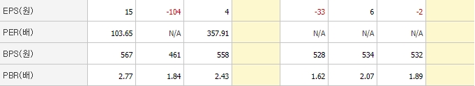 2020년 9월 분기 기준 PER은 -46.97로 동일업종과 비교했을 때 많이 낮은 편입니다. 반면 PBR은 2020년 9월 분기 기준 2.91로 아주 낮진 않습니다.