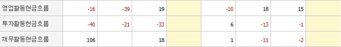 현금흐름 현황을 살펴보면, 영업활동현금흐름을 제외하곤 상황이 별로 좋지 않아보입니다. 더욱 지켜봐야할 듯합니다.