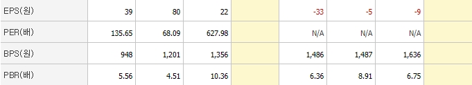EPS는 계속 하락하고 있는 모습을 보이고 있어 조금 더 지켜봐야 할 듯합니다. PER은 2020년 9월 분기 기준 -704.11로 동일업종과 비교했을 때 낮은 편이지만 PBR은 동일업종에 비해 조금 높은 편에 속합니다.