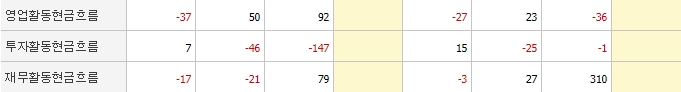 2020년 9월 분기 기준으로 영업활동현금흐름은 크게 하락했지만 투자활동현금흐름은 개선이 되는 중으로 보입니다. 또한 재무활동현금흐름은 2020년 9월 크게 상승한 모습을 보입니다.