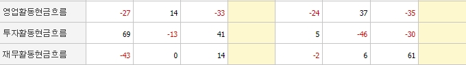 현금흐름 현황을 살펴보면 재무활동현금흐름 상황은 좋아지고 있지만, 영업활동현금흐름은 하락세를 보이고 있어 상황이 좋지 않습니다. 이 부분은 좀 더 지켜봐야 할 듯합니다.