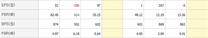 EPS는 분기마다 변동성이 큰 편이라 판단하기 힘들 듯하고 PER은 동일업종과 비교했을 때 비슷한 수준입니다. 하지만 PBR은 동일업종에 비해 조금 높은 편으로 보입니다.