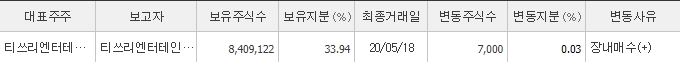 최대주주는 티쓰리엔터테인먼트이며, 약 34%의 지분을 보유하고 있습니다. T3엔터테인먼트는 한빛소프트의 모회사이며 게임 개발사입니다.