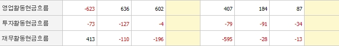 현금흐름 현황을 살펴보면 영업활동현금흐름이 지난해, 큰 폭으로 하락한 것을 볼 수 있습니다. 투자활동현금흐름과 재무활동현금흐름 또한 상승하고 있긴 하지만 적자를 면하지 못하고 있으니 좋은 상황으로 보이진 않습니다.