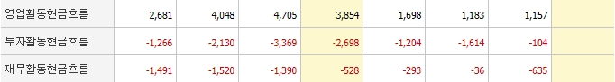현금흐름 현황을 살펴보면, 영업활동현금흐름은 큰 변동 없이 꾸준히 성과를 내는 반면 투자활동현금흐름과 재무활동현금흐름 상황은 좋지 않습니다.