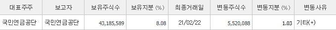 국민연금공단도 약 8%의 지분을 보유하고 있습니다.