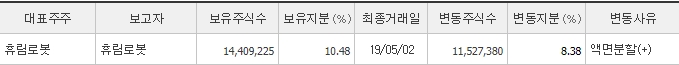 최대주주는 휴림로봇으로 약 10%의 지분을 보유하고 있습니다. 휴림로봇은 로봇 전문업체로 산업용 로봇, 모션컨트롤러, 서보시스템, 지능형로봇, 서비스 로봇 등을 판매하고 있습니다.