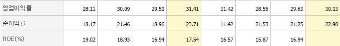 영업이익률과 ROE 모두 양호한 상태로 꾸준히 성과를 내고 있습니다.