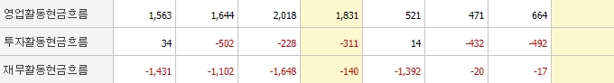 현금흐름 현황을 살펴보면 영업활동현금흐름은 양호한 반면 투자활동현금흐름과 재무활동현금흐름은 지난해 상황이 좋지 않았습니다.