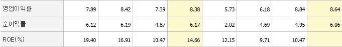 영업이익률은 꾸준히 성과를 내고 있고 ROE 상황도 좋은 편입니다.