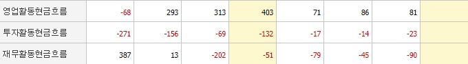 영업활동현금흐름은 상승하고 있지만 투자활동현금흐름은 계속 상황이 좋지 않습니다. 재무활동현금흐름까지 지난해 크게 하락한 모습입니다.