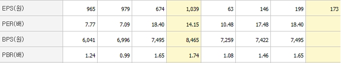 EPS는 2020년엔 조금 하락한 모습이지만 나쁘지 않습니다. PER은 10배를 넘기긴 했지만 동일업종과 비교했을 때 낮은 편에 속합니다. 하지만 PBR은 조금 높은 편입니다.