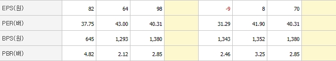 PER은 동일업종과 비교했을 때 비교적 높은 편이지만 PBR은 낮은 편에 속합니다.