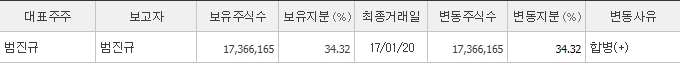 최대주주는 드림시큐리티의 대표인 범진규 님으로 약 34%의 지분을 보유하고 있습니다.