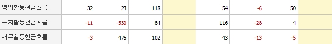 현금흐름 현황을 살펴보면 영업활동현금흐름은 지난해 큰 폭으로 상승했습니다. 투자활동현금흐름 또한 지난해 큰 상승이 있었습니다. 하지만 재무활동현금흐름은 2019년에 비해 하락한 모습입니다.