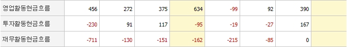 영업활동현금흐름 상황은 매우 좋다고 볼 수 있으나 재무활동현금흐름은 개선이 필요해 보입니다.