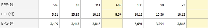 ▶EPS이란 기업이 벌어들인 순이익을 그 기업이 발행한 총 주식수로 나눈 값으로 주당순이익을 뜻합니다. 주당순이익이 높다는 것은 그만큼 경영실적이 양호하다는 뜻이며 배당 여력도 많으므로 주가에 긍정적인 영향을 미칩니다.