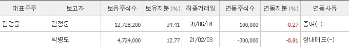 최대주주는 서플러스글로벌의 대표인 김정웅 님으로 약 34%의 지분을 보유하고 있습니다. 그 뒤로는 사내이사 박병도 님이 약 13%의 지분을 보유하고 있습니다.