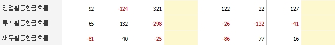 영업활동현금흐름은 2019년에 비해 2020년은 크게 상승한 모습이지만 투자활동현금흐름과 재무활동현금흐름은 하락했기에 조금 더 지켜봐야할 듯합니다.