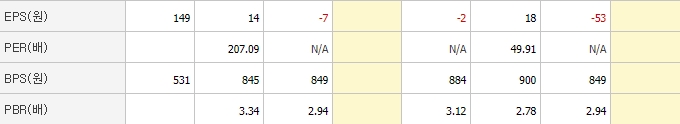 EPS는 계속 하락하고 있어 좋지 않은 상황입니다. PER은 동일업종에 비해 낮은 편이지만 PBR 수치는 동일업종에 비해 높습니다.