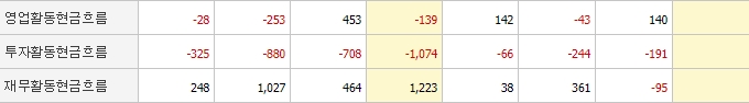 영업활동현금흐름은 지난해 적자를 면하고 크게 상승한 모습이지만 투자활동현금흐름 상황은 좋지 않습니다. 그나마 다행히도 재무활동현금흐름은 안정적인 편입니다.