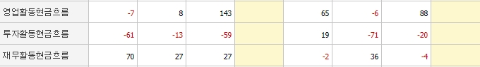 영업활동현금흐름과 재무활동현금흐름 상황은 비교적 안정적이나 투자활동현금흐름은 계속 적자를 내는 것으로 보아 상황이 그다지 좋지 않아 보입니다.