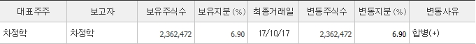 최대주주는 휴마시스의 대표인 차정학 님으로 약 7%의 지분을 보유하고 있습니다.