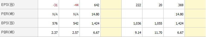 EPS는 지난 해 크게 상승했고, PER은 동일업종에 비해 조금 높은 편에 속합니다. PBR은 낮다고 볼 수 없지만 동일업종에 비교했을 때는 비교적 낮습니다.