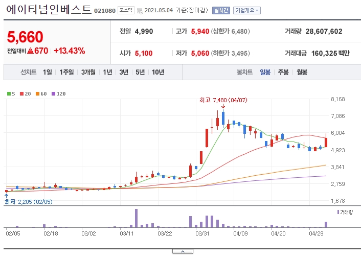 주봉 주가를 보면 에이티넘인베스트가 두나무 관련주로 분류된 후로 주가의 폭발적인 상승이 있었다는 것을 한눈에 볼 수 있습니다. 투자자들의 코인에 대한 관심이 늘어나 업비트를 운영 중인 두나무의 가치가 상승했기 때문일 겁니다. 지난 4월 뉴스에 따르면 업비트의 기업가치가 100조원까지 가능하다는 전망이 나왔다고 합니다. 두나무 미 상장에 관한 소식이 계속적으로 나오고 있기 때문에 주가는 기대해볼만합니다. 에이티넘인베스트의 현재가는 작년 최저점인 984원에 비하면 약 5배 이상 상승한 것으로 보입니다.