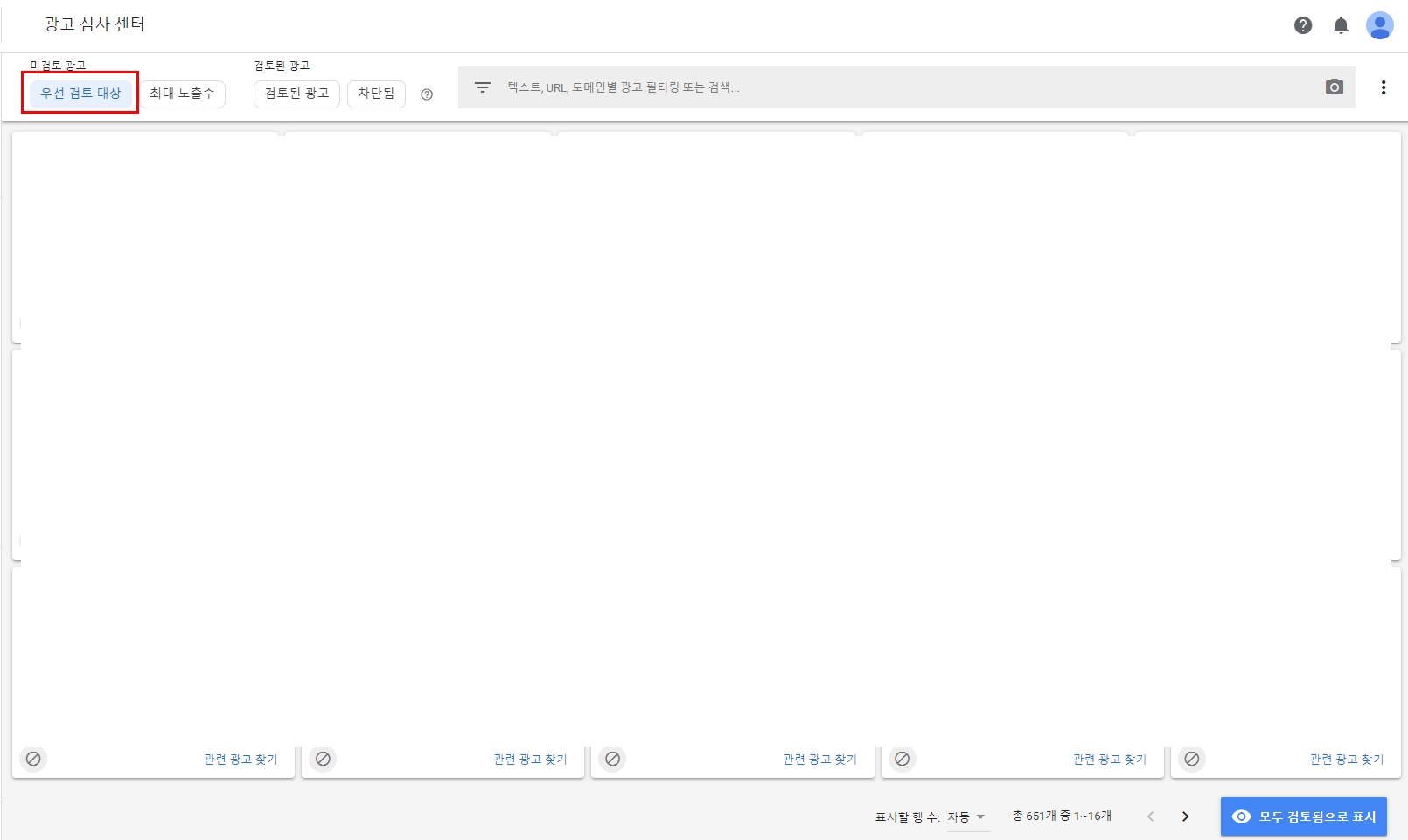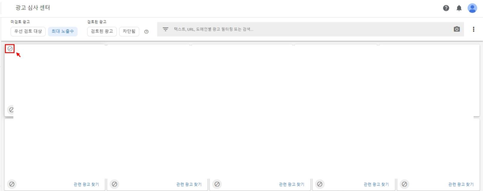 차단 관리 - 광고 심사 센터에 들어가면 이런 화면이 뜹니다. 제가 빨간색 상자로 표시해 놓은 부분을 보시면 최대 노출수라고 되어있습니다. 사실 우선 검토 대상이나 최대 노출수 둘 다 들어가서 검토하셔도 됩니다. 하지만 검토하려고 하는 광고는 우선 검토 대상보다는 최대 노출수에서 많이 클릭하게 되더라고요.. 아무래도 우선 검토 대상에는 민감한 주제나 소재를 다룬 광고들이 많아 검토보다는 차단을 클릭하는 경우가 많았습니다.