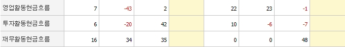 현금흐름 현황을 살펴보면 분기마다 변동이 꽤 큰 것으로 보입니다. 그중 영업활동현금흐름과 투자활동현금흐름은 개선이 필요한 듯합니다.