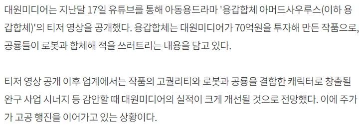 지난달 17일 유튜브를 통해 대원미디어는 용갑합체의 티저 영상을 공개했고 그 후로 주가가 상승하고 있는 모습입니다. 대원미디어가 70억 원을 투자해 만든 작품인데 공개 이후 약 37만 회의 조회수를 기록하는 폭발적인 관심을 받고 있습니다.
