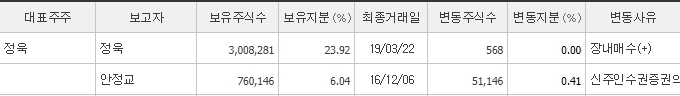 최대주주는 대원미디어의 대표인 정욱 님으로 약 24%의 지분을 보유하고 있씁니다. 그 뒤로는 부인인 안정교 여사가 약 6%의 지분을 보유하고 있습니다.